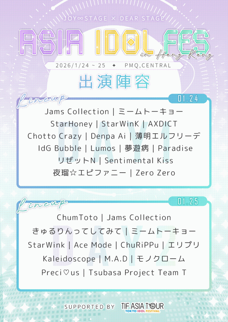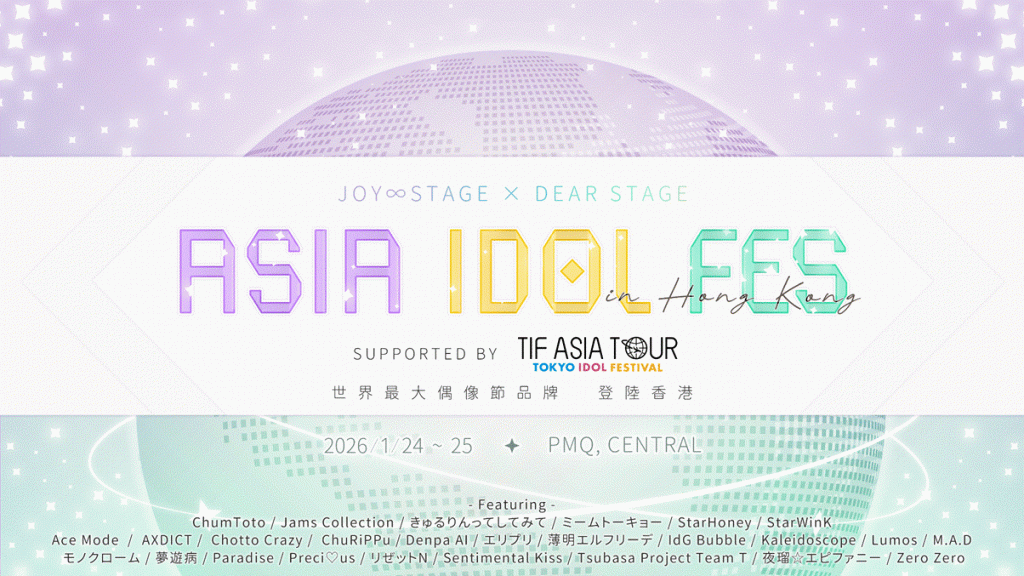 香港演唱會活動品牌「JOY∞STAGE」繼2025年10月邀請來自日本的「高嶺のなでしこ」、「虹のコンキスタドール」和「ChumToto」演出後,2026年1月將與日本知名偶像製作公司DEAR STAGE聯手,在「TIF ASIA TOUR」的支援下,將會打造本地歷來規模最大、最具話題的偶像音樂節,集結亞洲各地新世代偶像實力派團隊,齊聚香港,讓正統的偶像節文化在香港再現。