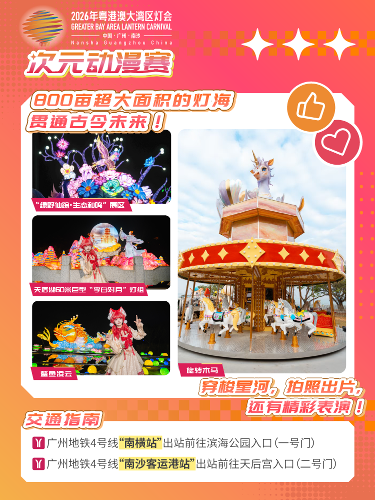 2026年粤港澳大湾区灯会以“湾区同心·华彩千秋”为主题,以“科技赋能文化传承,创新驱动品牌发展”为核心理念,植入更多科技、光影元素,与外部热点IP联动,并联动地方媒体一同打造广东灯会春晚。灯会展期自2月10日至5月10日,长达90天,选址滨海公园、南沙天后宫景区,按“三轴五区”布局,占地800亩,主游线超2.5公里,五大园区各具特色,为游客带来广阔壮丽的观赏空间与充足的赏灯时光。