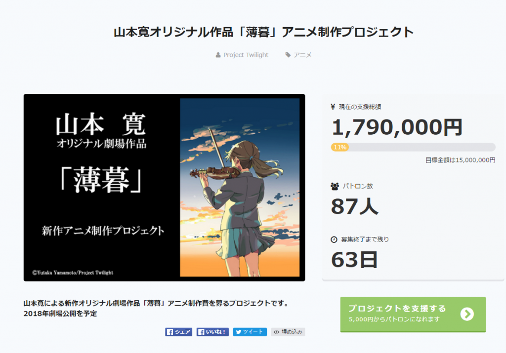 日本知名监督山本宽继2015年开启《Wake Up,Girl!》企划之后曾经匿迹了一段时间。而近日宽叔时隔两年公布了一个新企划——将其原作小说《薄暮》动画电影化,预计2018年上映!宽叔也为此开启了众筹,众筹目标1500万日元,单人捐赠50万日元更是可以获得电影角色的命名权!截到发稿时,《薄暮》已众筹到179万日元!众筹地址:https://camp-fire.jp/projects/view/11715