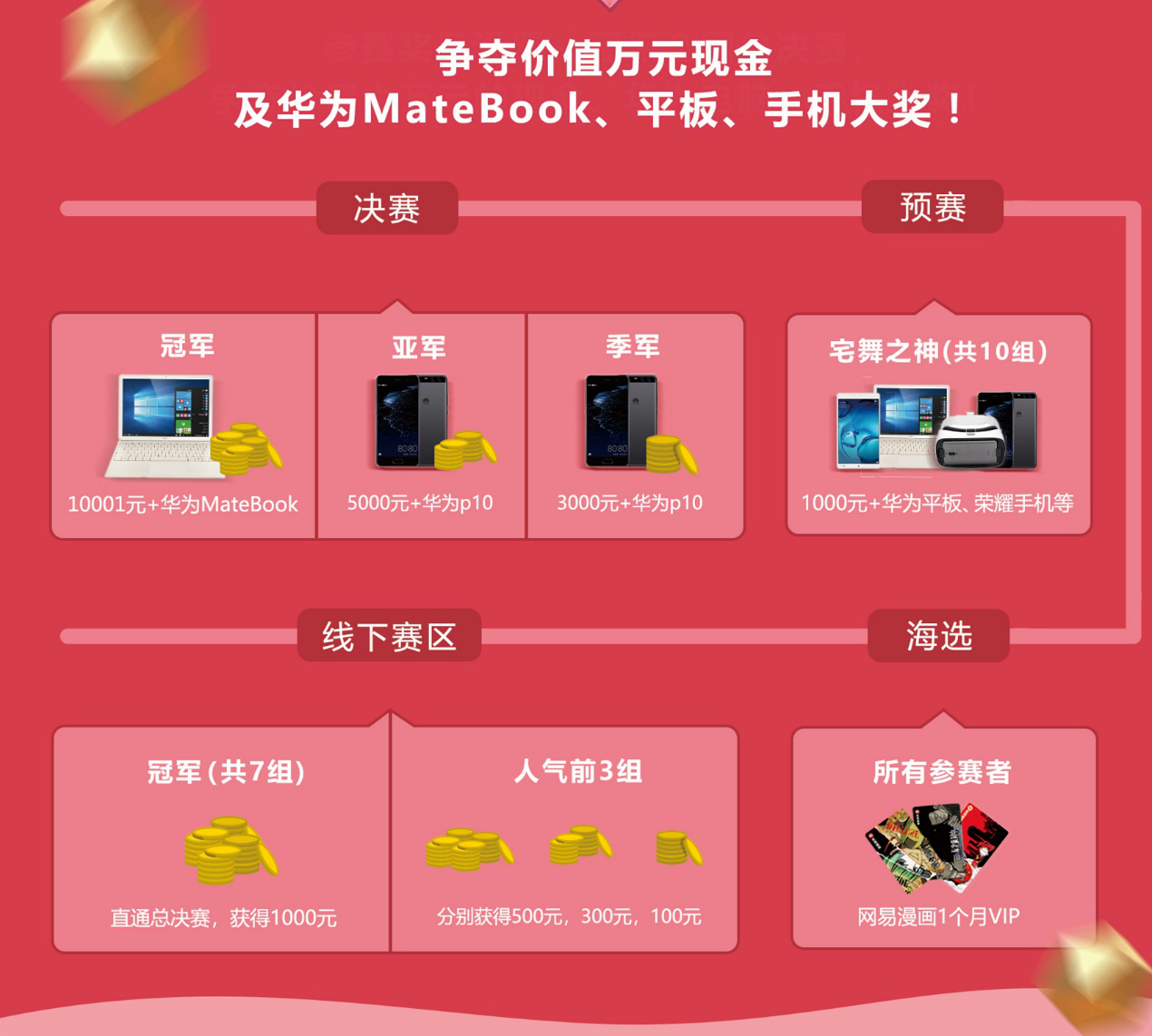 本届宅舞大赛网易漫画特别携手华为应用市场联合举办。参赛选手有机会获得万元大赛奖金和平板电脑、手机等精美华为终端产品,成为2018年度网易漫画宅舞形象大使! 投票还可获得华为荣耀7X、华为VR、网易考拉优惠券、网易严选免单券等十多种总价百万的奖品~