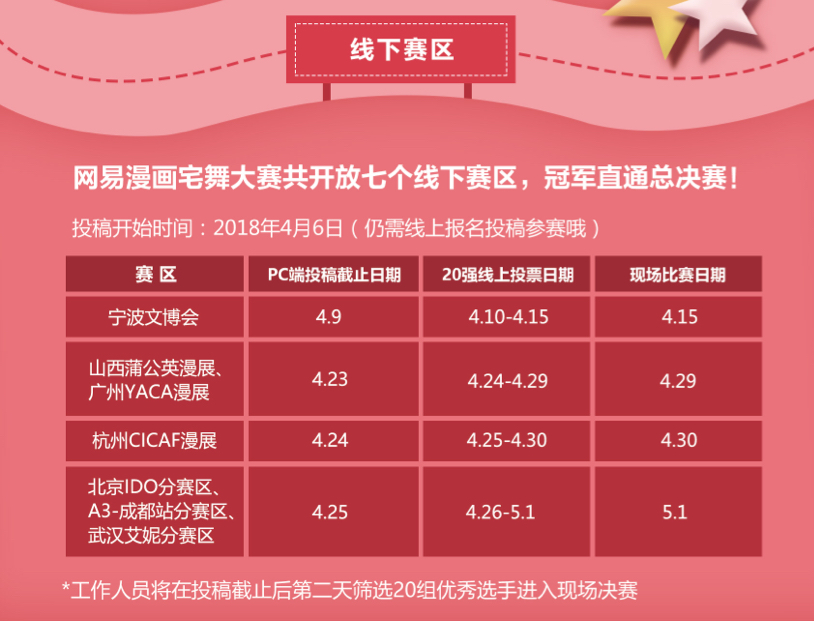 二、设立线上、线下两个赛区。七个线下分赛区预先开启,冠军将直通总决赛,而其他选手可以在线上赛区“复活”,继续参加后续比赛!双赛区=双保险,获奖机会空前,还不来参加吗?